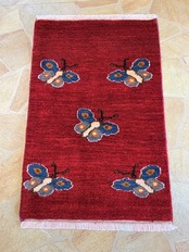 自然の素材を使った手織りのギャッベ KASHKOLI 90cmX60cmです。美しい蝶柄のコンビネーションが目を引きます。ウール100%素材なので、季節を問わず心地よく使えます。