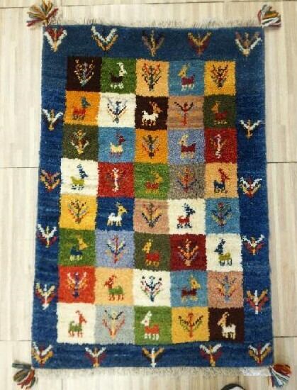 手織りによる、温かみのあるウール製のギャッベです。ブルーの美しい色合いが、お部屋のアクセントになります。一枚一枚手作りされた絨毯は、均一な柄や色ではなく、独特な味わいがあります。そのため、お客様がお手元に届く製品は写真と多少異なる場合がございますが、手作りならではの味わいや温かみを、感じていただけると思います。